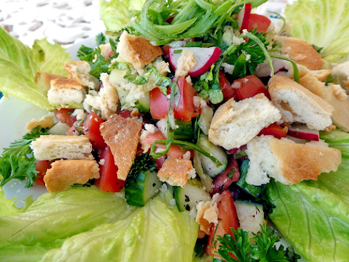 Fattoush 源自亞拉伯語fatt,解作擠壓的意思。 Fattoush流行於敘利亞,後傳至黎巴嫩及整個中東地區。將烤或炸過的中東扁平麵包塊khubz,混合各式時令蔬菜和香草,再加上sumac來添加酸味。